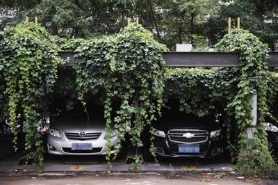 車庫的上層爬滿藤蔓植物,將車位的金屬鋼板及鋼架完全覆蓋,已無法看出原來的模樣。